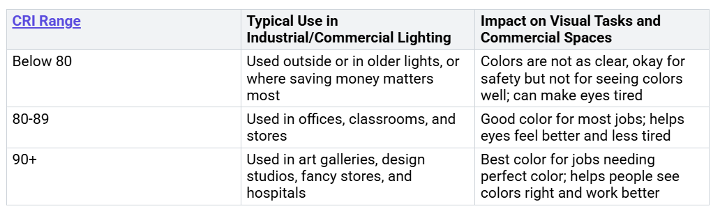 Šviesos diodai ilguose, plonuose šviestuvuosepadėti suteikti tolygiai šviesą. Tai palengvina jūsų akis ir padeda geriau matyti. Įmonėse svarbu spalvų tikslumas. Pramoninis linijinis apšvietimas paprastai turi aCRI nuo 80 iki 90. 80 ar daugiau CRI tinka daugeliui darbų. 90 ar daugiau CRI yra geriausias tose vietose, kur spalvos turi būti tikslios. Didesnis CRI reiškia geresnę spalvą, didesnį komfortą ir saugesnį darbą. Tai padeda žmonėms geriau atlikti savo darbą.